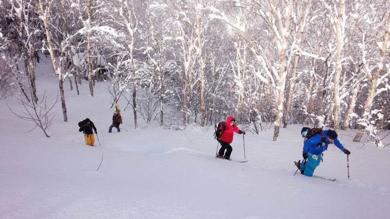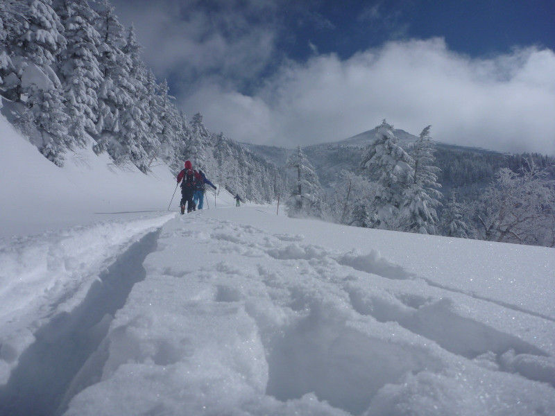 シール組は良いが、ボードを担いだテラジさんは樹林帯の雪がボードに当り、雪がわさわさ頭にかかって大変。。。